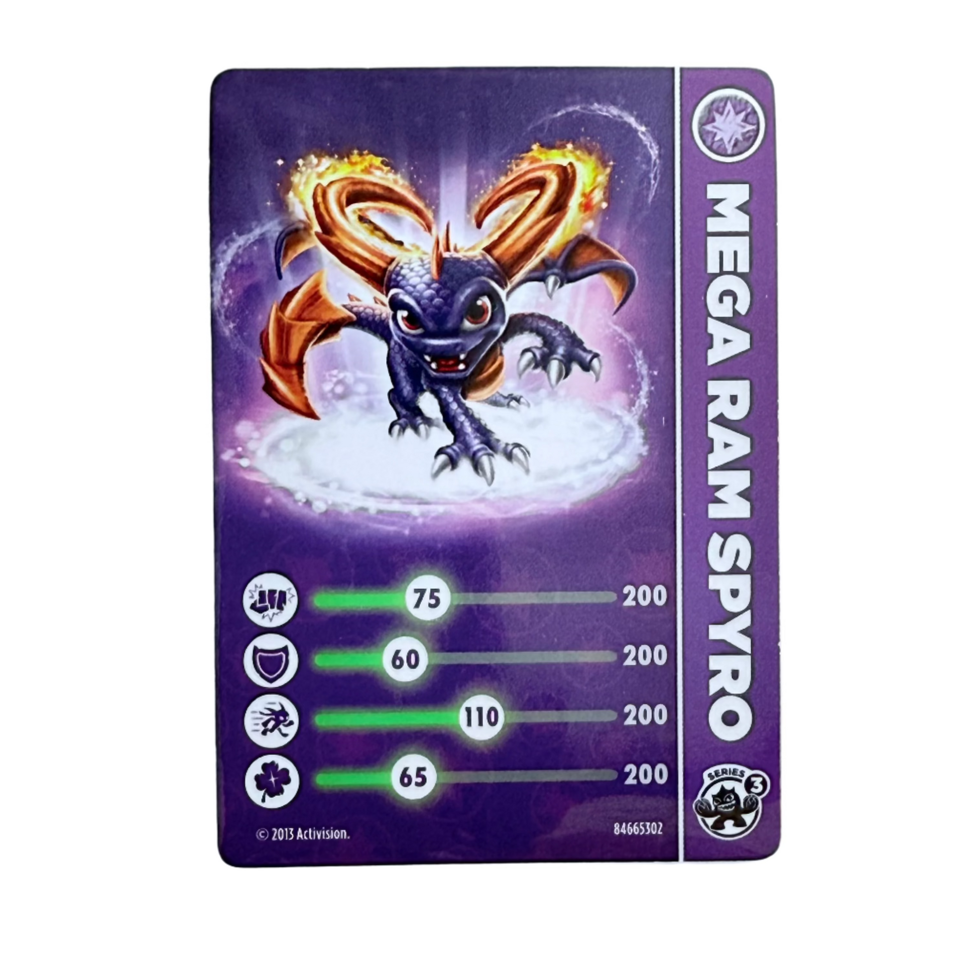 This is the stat card that was originally packaged with Series 3 Mega Ram Spyro in Skylanders Swap Force.